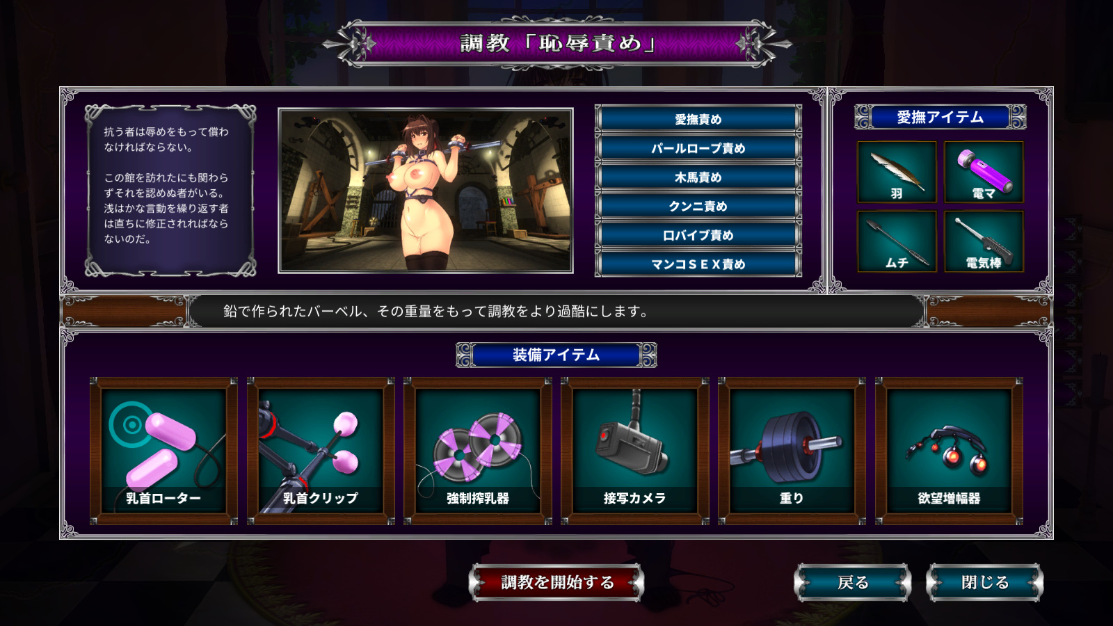 ヒロインは最初は抵抗しますが、ねちっこく激しい調教を受けることで、徐々に快楽に弱くなっていきます。ゲームプレイの流れとしては、多彩な調教を続けることでヒロインのカラダを開発していき、調教レベルとエロステータスを上昇させていきます。ステータスの上昇によりヒロインは快楽スキルを身に付けていくと同時に、プレイヤーが選択できる新しい調教プレイが順次解放されていきます。そして、より強烈な調教プレイでヒロインをさらに凌辱していくという構成となっています。なおヒロインの持つエロスキルは一度ゲームクリアすると取外しが自由に可能となります。